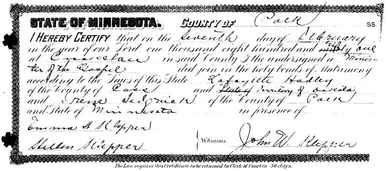 Marriage Certificates of 5332121 Katie Irene Sedgwick and Lafayette Hadley.