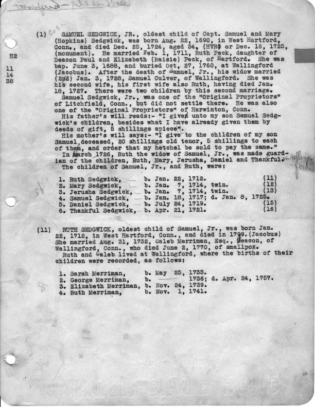 Please proofread the text below and notify me whether it is correct. (1) Samuel Sedgwick, Jr., was one of the "Original Proprietors" of Litchfield, Conn., but did not settle there. He was also one of the "Original Proprietors" of Harwinton, Conn. His father's will reads:- "I give unto my son Samuel Sedgwick's children, besides what I have already given them by deeds of gift, 5 shillings apiece." His mother's will says:- "I give to the children of my son Samuel, deceased, 20 shillings old tenor, 5 shillings to each of them, and order that my hetchel be sold to pay the same." In March, l726, Ruth the widow of Samuel, Jr., was made guardian of the children, Ruth, Mary, Jerusha, Daniel and Thankful. The children of Samuel, Jr., and Ruth, were: