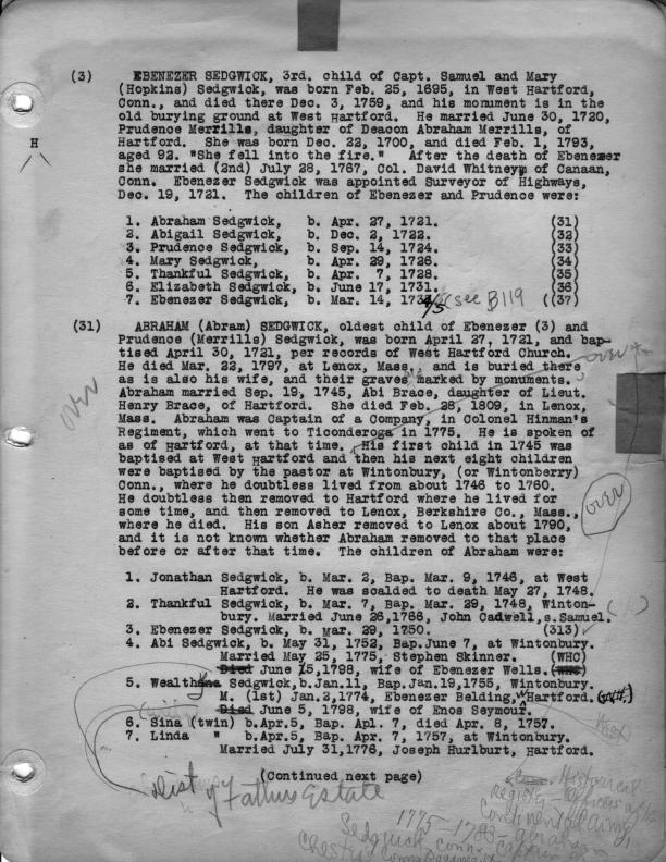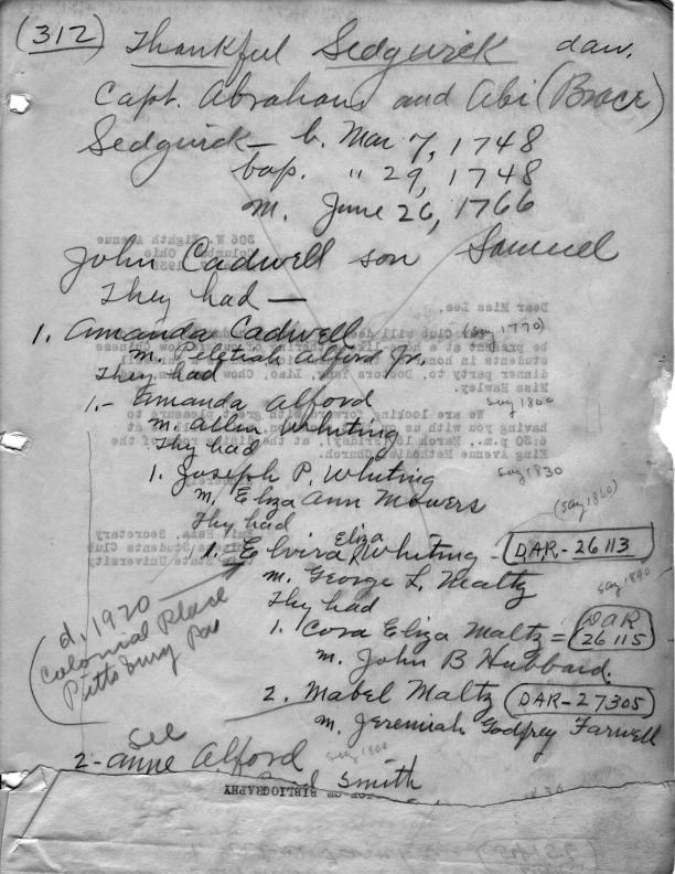 | It is interesting to note that in the 1934 manuscript Francis Morris Sedgwick showed Thankful's spouse as Joseph Cadwell, but by 1950 Hubert had changed it to John, apparently on the word of the descendant who provided the data in the handwritten sheet above. In fact, it was Joseph Cadwell, as shown in the records of the West Hartford Congregational Church, an extract of which is here. |
