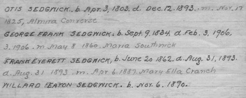 41132 - Otis Sedgwick 411325 - George Frank Sedgwick 4113251 - Frank Everett Sedgwick 41132511 - Willard Eaton Sedgwick on back: