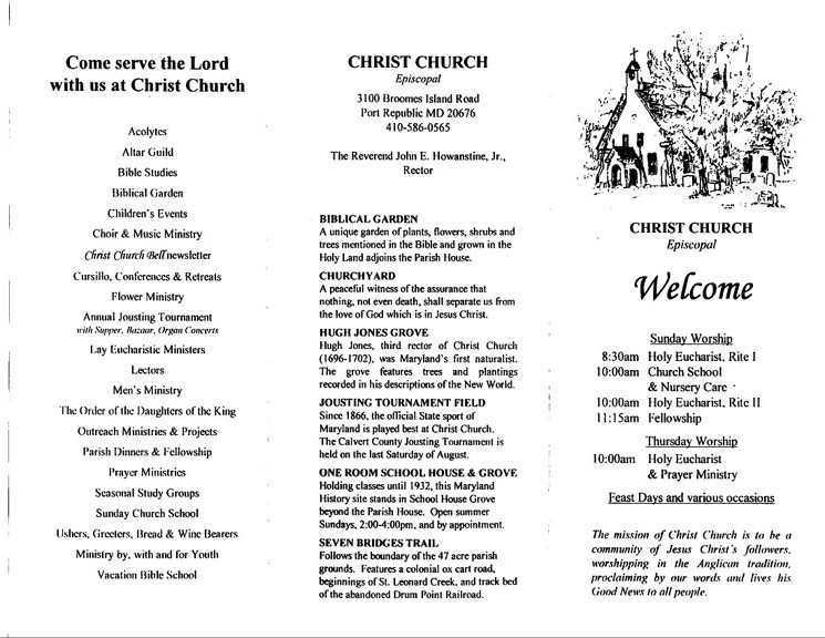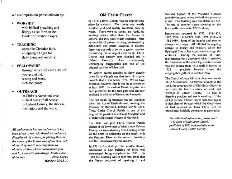 CHRIST CHURCH PARISH, PORT REPUBLIC As early as 1672 there was a log church standing in what in 1692 was defined as Christ Church Parish. It is certain that in 1692 a church building was standing in this Parish, called by the name "Christ Church", and located on one acre of ground given by Francis Malden out of his tract "Prevent Danger". With the establishment of the Parish in 1692 the first business of the Vestry was to repair the church building which continued in use until about 1731 when it was destroyed by fire. In the session of the general Assembly of Maryland., July-August 1732, upon petition of the Vestrymen, Churchwardens and inhabitants of Christ Church Parish which stated that the church and vestry room had lately burned, and that the congregation was desirous of rebuilding, an Act was passed empowering the Vestry and Wardens to have a new church and vestry room built on that acre of ground where the old church had stood. An assessment of 100,000 pounds of tobacco on the taxable inhabitants of the Parish (not to exceed 40,000 pounds in any one year) was authorized for defraying all expenses to be incurred. By 1735 this second building - a brick church - had been completed and occupied. At the November 1769 session of the General Assembly an Act was passed authorizing an assessment of 160,000 pounds of tobacco to be levied in the years 1769-70-71, to be applied to the building of a new church in Christ Church Parish on the ground where the second church then was standing. This building - the present church - was built in 1772 with materials and. bricks from the older structure. Repairs and renovations were made in 1792, 1839, 1862, 1906, 1928-29, 1946-50, and 1963. The Parish House was built in 1957-58, and the Rectory in 1959 on the site of an earlier one. There must have been early pieces of Communion Silver at Christ Church dating from the late 17th or early 18th centuries (Middleham Chapel has a Silver Service from Queen Anne), possibly they were destroyed in the fire of 1731. The present Communion Silver Service is old. Maryland. There is a pair of chalices and. a paten, in continuous use, made in 1819 by Hosea Wilson of Baltimore. (Those pieces are identified in "Maryland Silver Smiths", by Pleasants and Sill, page 204.) The silver wine flagon bears hallmarks of Maryland silver made after 1830 and has the name F.A.Greshoff. As he is not known to have been a silver smith, it is possible that he was a dealer in church goods, perhaps in Baltimore. The smaller water cruet is a recent reproduction done by the Schofield Company of Baltimore; and the lavabo bowl and bread. box are also pieces of contemporary manufacture, as are the festival chalice and paten of gold on sterling. At the rear of the Church there is an old Bible, used here for many years, printed in Cambridge, England, in 1674. The offshoots of Christ Church Parish are: Middleham Chapel at Lusby, said to have been housed in1684, though the present building was erected in 1748; Saint Paul's Church, Prince Frederick, which was organized as a Parish in 1841, the church being completed in the following year and Saint Peter's Chapel, Solomon' Island, which was built in 1889. |