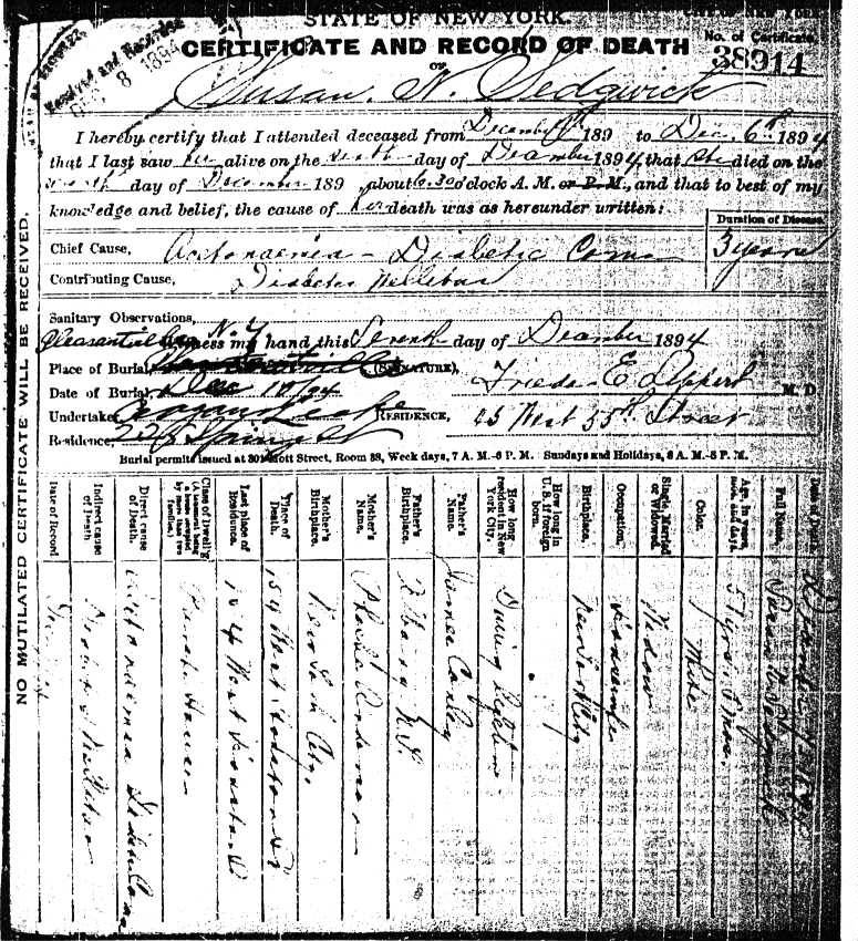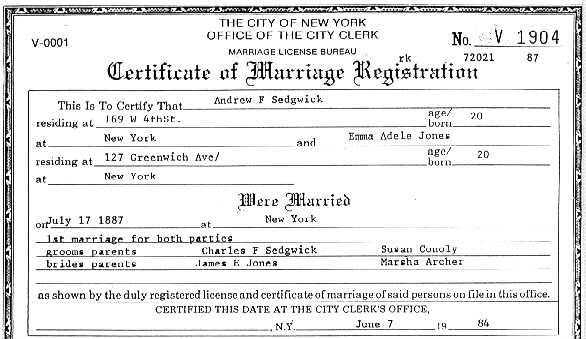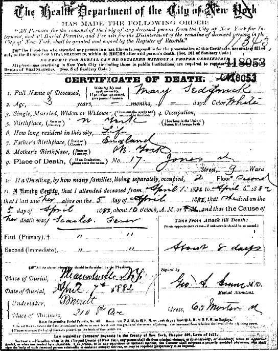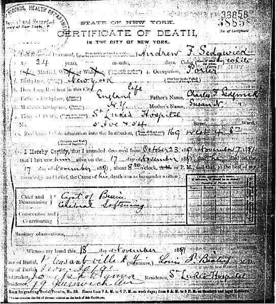 b. June 29, 1864, New York, New York d. January 24, 1903, New York, New York m. June 18, 1882, New York, New York, Amos Atkinson Andrew F Sedgwick b. 1867, New York, New York d. November 17, 1891, New York, New York (certificate) bu Pleasantville, New York m. July 17, 1887, Emma "Adele" Jones (certificate) Charles Sedgwick b. 1869, New York, New York James Sedgwick b. 1874, New York, New York Mary E Sedgwick b. 1878, New York, New York d. April 5, 1882, New York, New York (scarlet fever) (certificate) bu Pleasantville, New York |