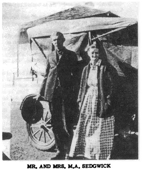 Selma Sedgwick sent this history by Myrtle (Sedgwick) Carothers Mathue Sedgwick Mathue Sedgwick was born Oct 1, 1860 in Illinois. I know nothing about our family. My father has a brother, Robert who lives in Silverton, Briscoe County, Texas, and he made several trips back to Illinois before he was determined to live in Texas. He married Callie Finley and they had three sons, Claud, Jim and Arthur. After Arthur was born, Callie died on March 10, 1899, and father married Minnie Etter. Four children were born to them, Ollie, Myrtle, Edna and Oby. At this time we lived near Bowie, Texas. From Bowie, we moved to Briscoe County, and then to Clay County, Henrietta, things were not good for us there, so we moved to Ira in Schurry County, there was a big drought then, and daddy wanted to move to the plains, so we moved to Haskell. There times were better, daddy made a good cotton crop and was presented a prize by the banker, who was W.B. Lee, imagine my daddy's when we came to Dickens County to see Mr . Lee. We left Rochester and started to New Mexico to take up a claim. I remember so well we came by Dickens with four covered wagons and a bunch of horses. We camped all night at the place where the roadside park now is. The next morning we started for the Plains. We came to a farm house and the told us we could stay there until the snowstorm was over, it lasted for a week. We went on to Lovington, New Mexico and stayed there for two months while daddy and the boys looked for a claim they liked. He said he didn't see anything but rattlesnakes and prairie chickens, so we headed back for Texas, and this time we settled in Kress. We stayed there for one year. Then we left there and settled near Wellington and pulled cotton in the fall. Then we went on to Wheeler, soon it was time to move again, and we piled our things in the wagon and moved to Roaring Springs, we pulled cotton there for Mr. Mason, for feed for our horses and mules. In the spring of 1916 we moved to the Duncan Flat community in Dickens County. We bought a farm from Mr. Black, no improvements, we lived in tents and built a barn, which we lived in. There was a creek near by but we could not drink the water from it. We had our first Thanksgiving dinner in the barn we built. My brothers were good carpenters and so we went to work building a house and clearing our land, we girls burned the brush while the boys grubbed the mesquites, we made a good crop, and so were able to enjoy our first real Thanksgiving in a real home, after having traveled around for so many years. Our community did not have a school so we kids had to walk five miles to Chandler. Daddy gave the first hundred dollars and my brother helped build the school house at Duncan Flat. The first teacher was Mrs. Tom Whitaker and then Miss Mayme Hulsey. It was a one room schoolhouse and it also served as a church. In 1918 my brothers went to the Army for World War I. Edna and I had to help Father gather the crop. Daddy had never stayed in one place over two years, so he wanted to move, but Mother said "No, I am going to stay here with the children," the boys had already said that "they were here to stay." So we stayed. For entertainment we had parties, singing and fruit suppers, sometimes we went to Roaring Springs for picnics. In 1921 our school house and church burned tot eh ground. That summer we built an arbor and had a great revival. In the fall, another schoolhouse was built, this time there were two rooms, and a teacherage was constructed. Some of the teachers that I can remember that taught there were Mr. Bennett, Fred Arrington, Mr. Cozby, Delma Law, Harvey Lovell, Law Stone, and Lee Glen. Duncan Flat was a good rich farming community, with a good school and churches. The entire community seemed to enjoy each other, and if you needed help, the whole community was there to help you. It was a lovely place to live, but Father Time changed that picture. Most all the early pioneers have passed on; others have moved away, and there are only a few families left. Many homes have been torn down and the community doesn't look like it once ... still have pleasant memories ... friends were once a part of good old Dickens [Flat]. |