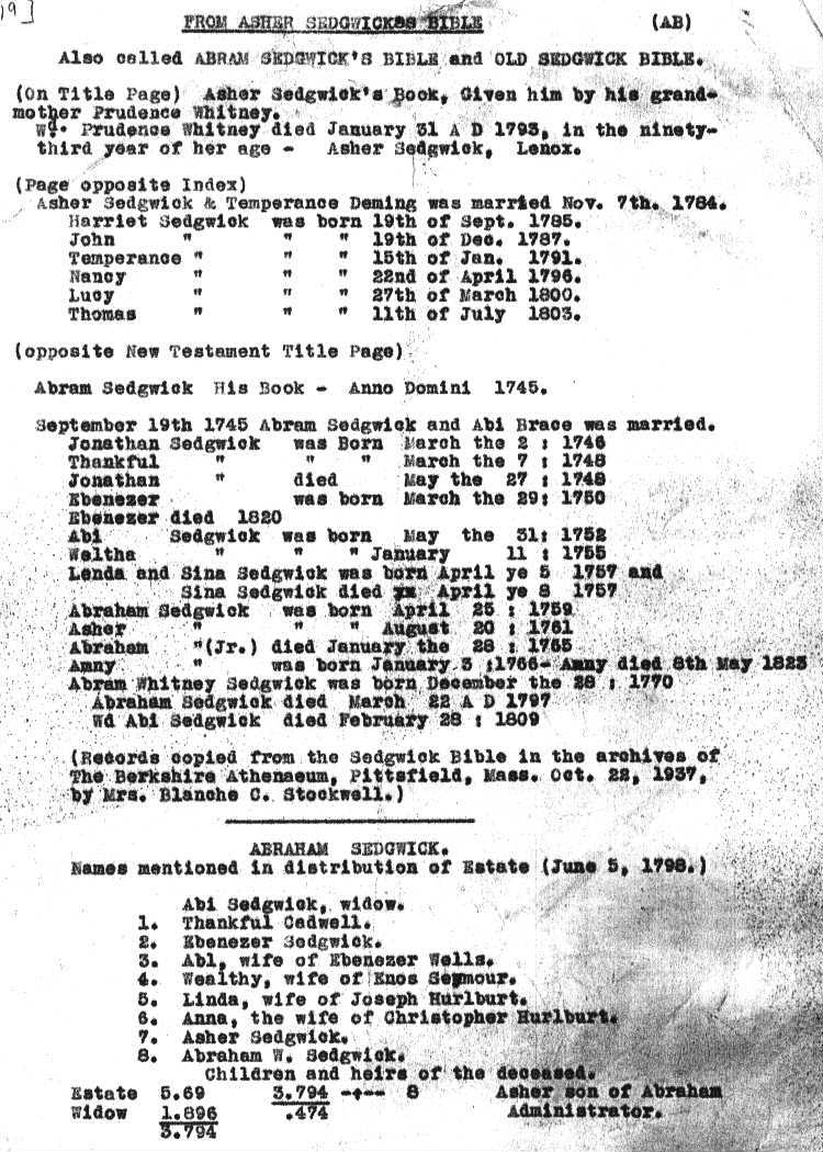 papers of Hubert Merrill Sedgwick, Francis Morris Sedgwick and Frederick J Sedgwick, 2. Census records, any of those indicated. 4. West Hartford, Connecticut, Congregational Church 5. Bible of Abraham Sedgwick 6. Massachusetts Town Birth Records