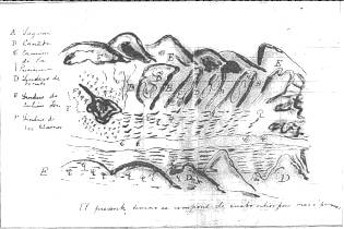 This is a copy of the actual map accompanying the application and grant. It is not decipherable, and it shows the lack of knowledge of the back country. Hence the long period between the grant and the final definition of boundaries. (This map is not unusual--other grants in the back country had equally vague diseños (maps).