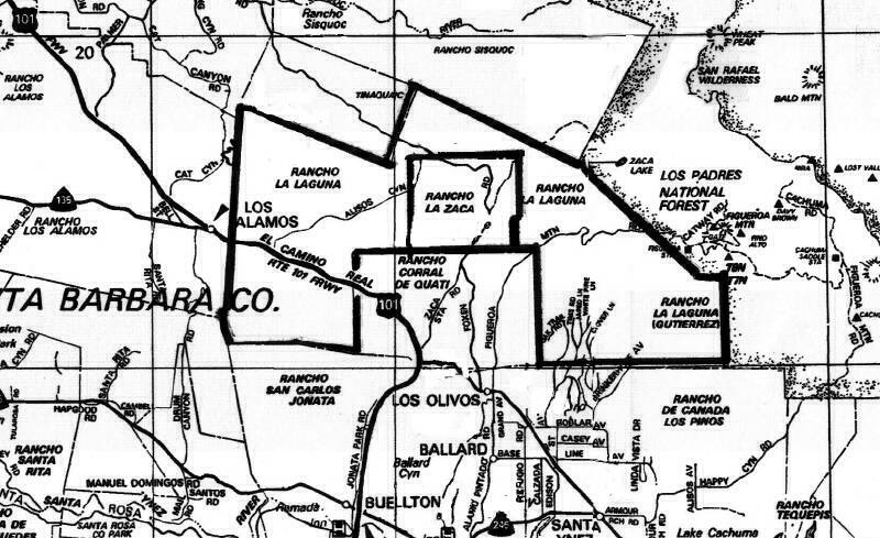 La Laguna was rolling grassland bisected by valleys. It has since been divided and subdivided into vineyards and ranchets. The original grant is an inverted "U" shape, generally bounded on the south by line marked by today's gate to the Sedgwick Ranch, on the East by the National Forrest, and on the west by Hwy 101 up to Los Alamos. Midland School and entertainer Michael Jackson's Neverland Ranch are part of the eastern lobe of La Laguna land, as is the Sedgwick Ranch. Two smaller ranchos divided the two lobes of La Laguna, Rancho La Zaca (4,458 acres) and Rancho Corral de Quati (13,322 acres). It gets complicated--see the map on the end page .