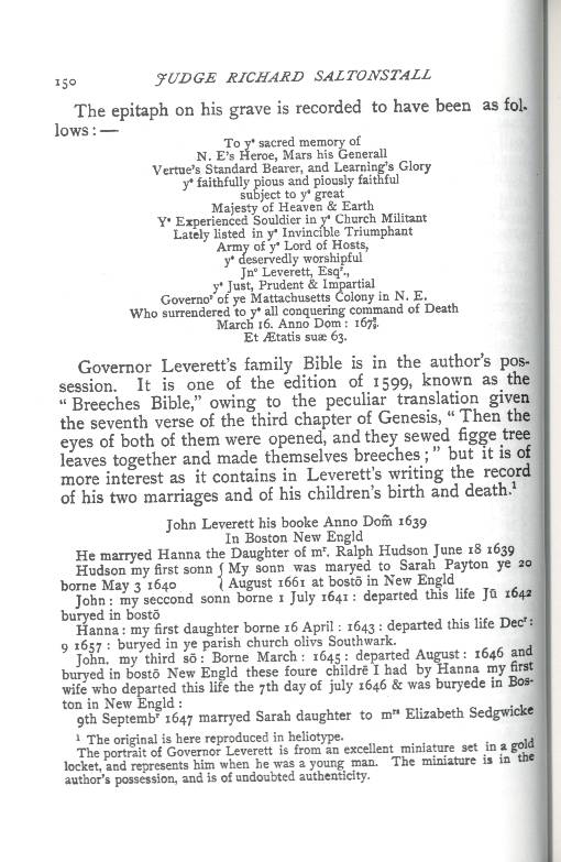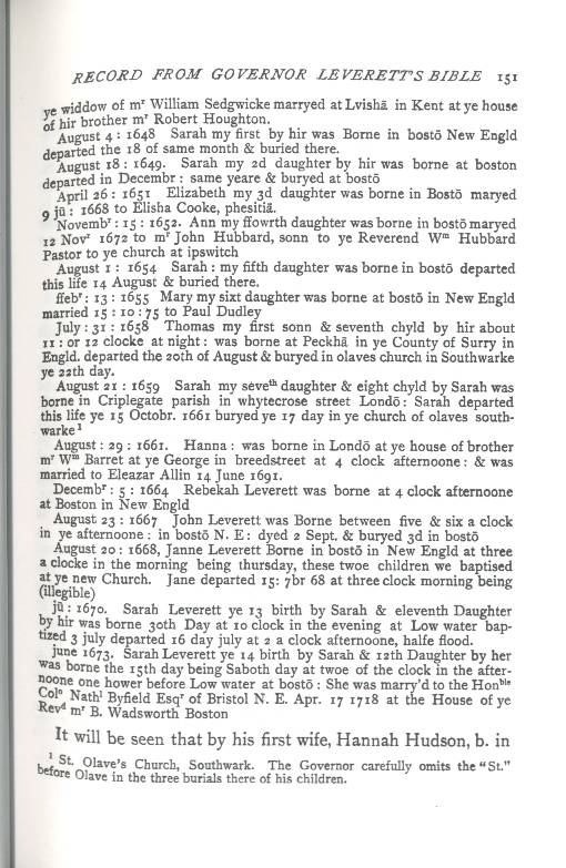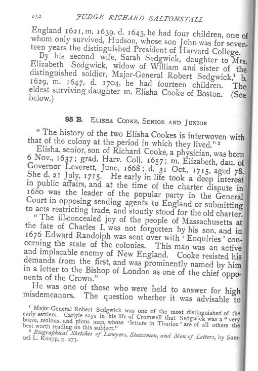 Sarah Sedgwick, sister of Robert Sedgwick b. abt 1631 d. abt JAN 2 1704/05, Boston, Massachusetts m. John LEVERETT 9 Sep 1647[18], Louisham, Kent, England It has become a matter of common knowledge that John Leverett, later the governor of Massachusetts, married Sarah Sedgwick. it has commonly been reported, including by Goodwin in his Genealogical Notes, that this Sarah Sedgwick must be a daughter of Major General Roberl Sedgwick. She was not, she was his sister. Governor Leverett's entry in his family Bible states "9th September 1647 marryed Sarah daughter to Mrs Elizabeth Sedgwick ye widow of Mr William Sedgwicke married at Louisha in Kent at ye house of hir brother Mr Robert Houghton."A reproduction in heliotype of the original entries in Governor Leverett's handwriting appeared in the privately published (1897) "Ancestry of Descendants of Richard Saltonstall", opposite page 150.* Hubert Merrill Sedgwick noted this in NHCHS MSS-B46 Box 6 Folder B sheet 17. Freda Lightfoot of the UK has sent the following pages from a reprint of the book. Unfortunately the reprint does not contain the image of the original pages, but I think this should be accepted as evidence enough to clarify which Sarah Sedgwick married John Leverett. * A daughter of John Leverett and his first wife Margaret Rogers married a Saltonstall, and a great-granddaughter of John Leverett and Sarah Sedgwick married a Saltonstall. |
