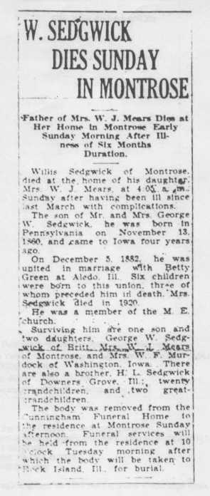 8. Mercer County, Illinois Cemetery Records 11. Personal knowledge of family members 18. Obituary of Willis Daniel Sedgwick |