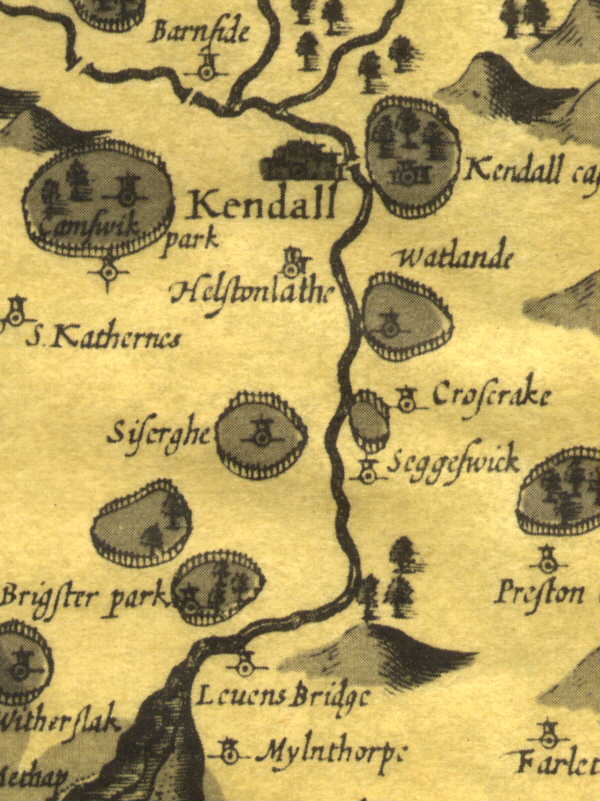 from the mid 1600's shows this spelling. The image below is a portion of a map of "The Countie Westmoreland and Kendale the Cheif Towne" [sic]. The map was drawn by John Speede between 1610 and 1623. The image is from a reproduction purchased from The Old Map Company of Great Britain and used by permission. Compare to this modern map. |